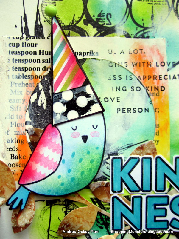 I smeared Distress Ink onto my circles, then punched a circular frame out of a cookbook page scrap. I stamped and fussy-cut the Kindness sentiment (colored with markers), and fussy-cut the bird, too. I also cut a section of foliage using a Simon die and a magazine page. I laid all the elements out.